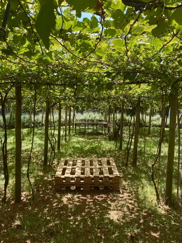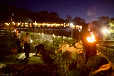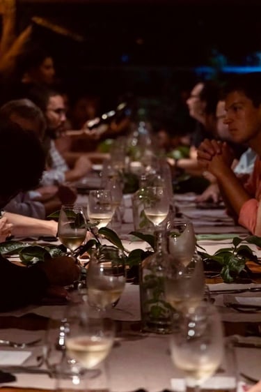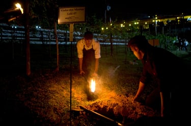 Entre 20h00 - 21h00 | O Ritual do Vinho dos Mortos: O ápice da noite. Saímos do restaurante sob o céu estrelado, guiados apenas por lampiões e carregando enxadas. No meio das parreiras, cada participante enterra a sua própria garrafa de vinho. Revivemos a tradição centenária onde a terra serve de adega natural.